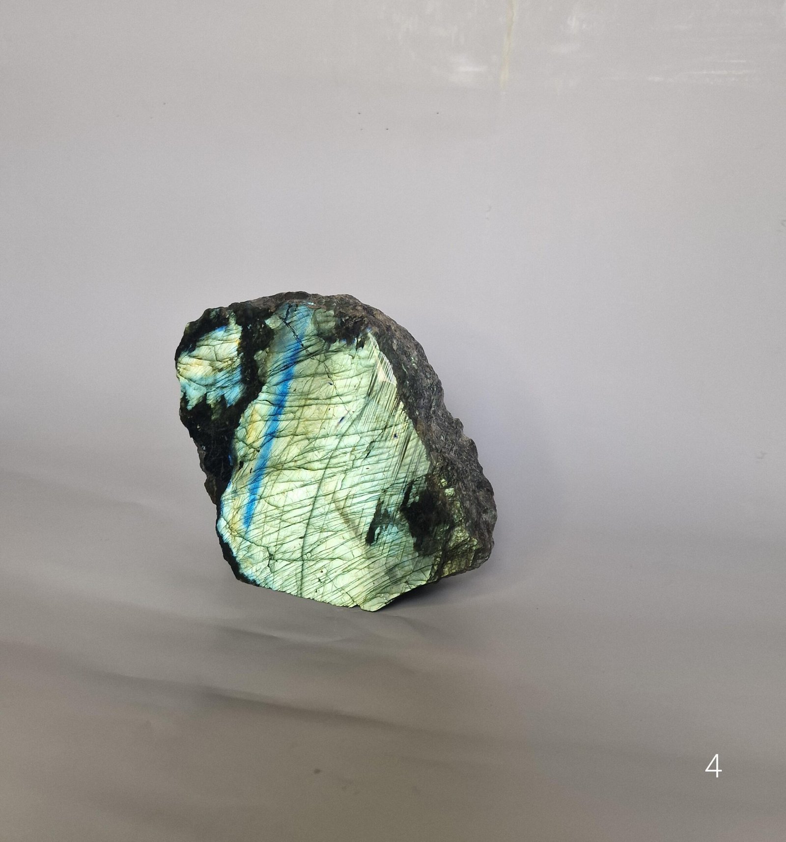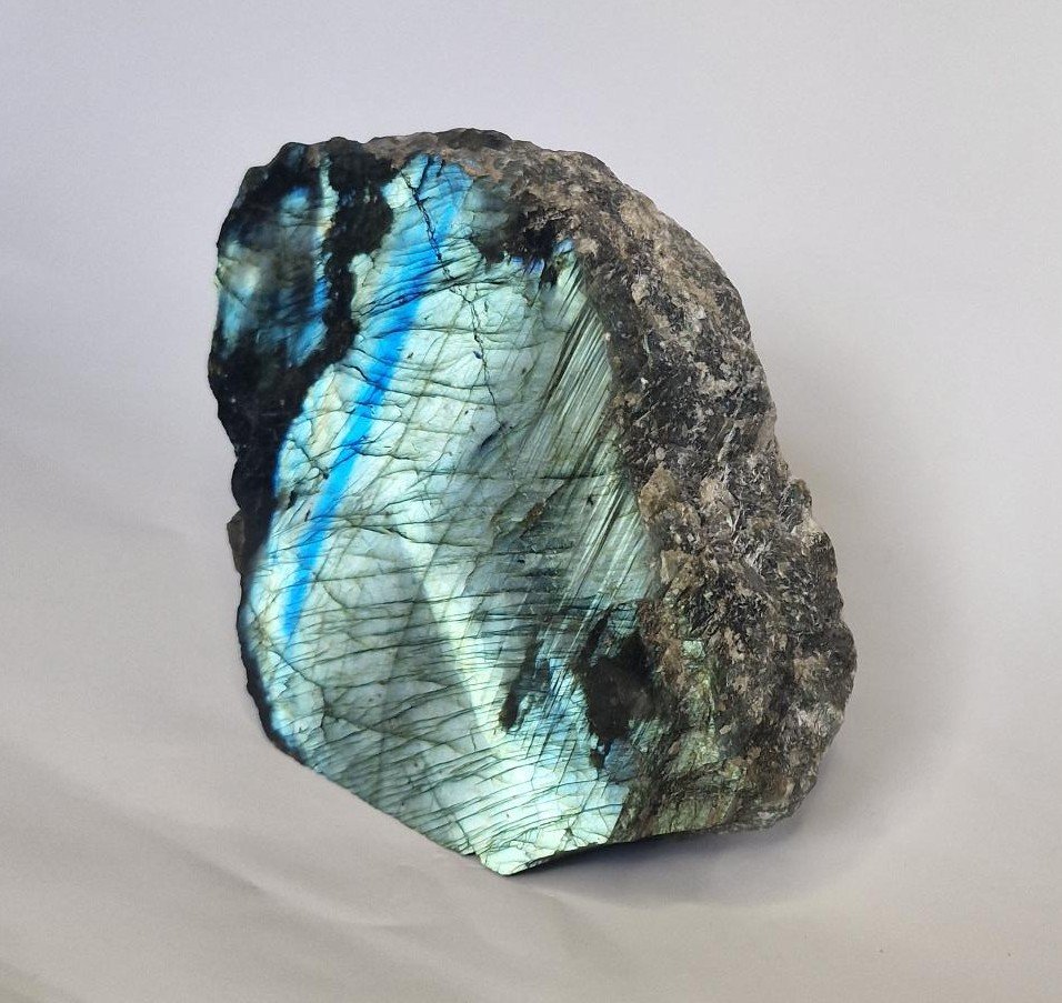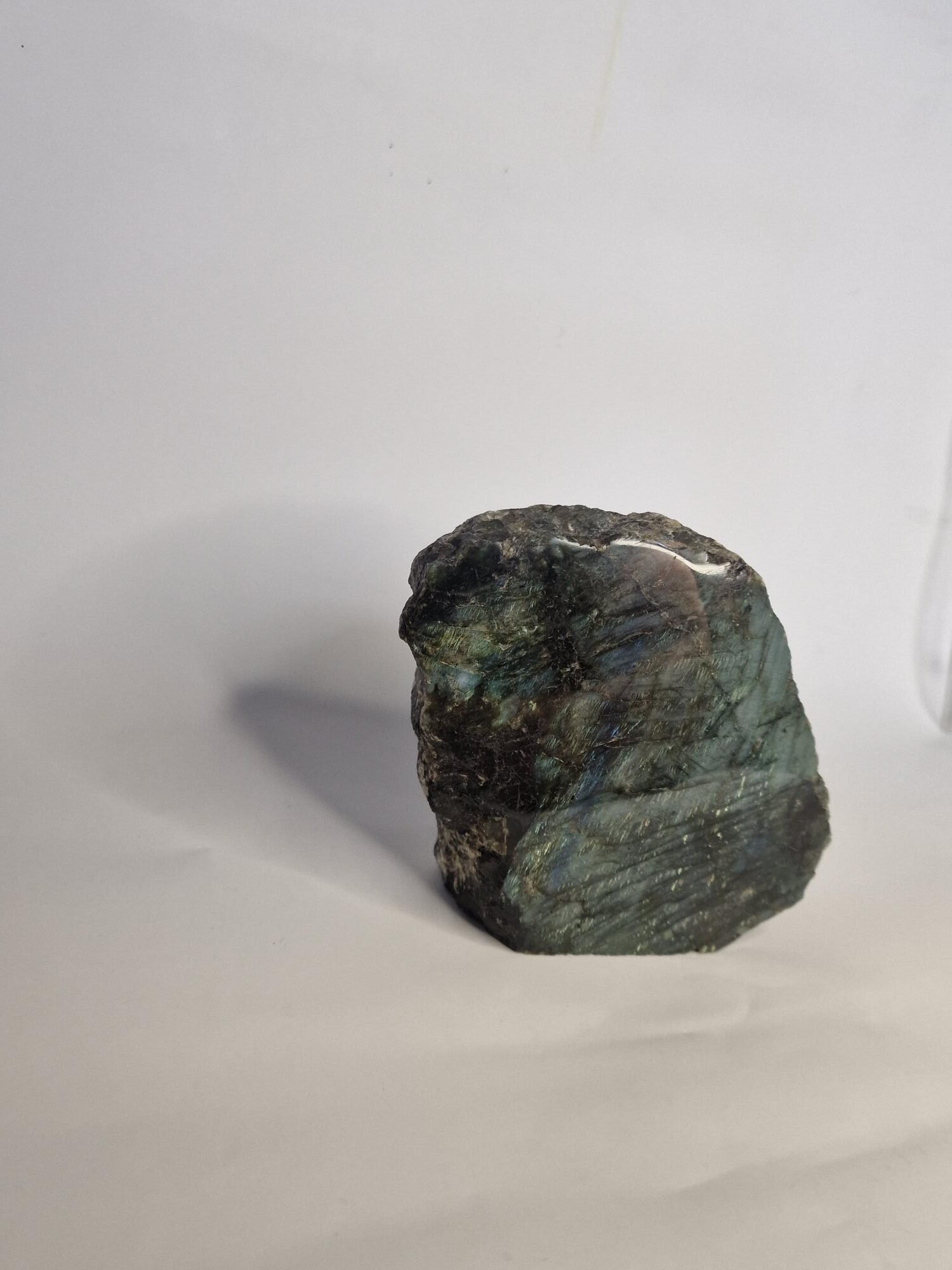 Cette Labradorite naturelle dévoile des reflets lumineux d’un bleu profond et d’un vert polaire qui évoquent l’éclat rare d’une aurore boréale cristallisée. Sa surface révèle des irisations intenses qui changent selon la lumière, donnant à cette pierre un caractère vivant et presque mystique.