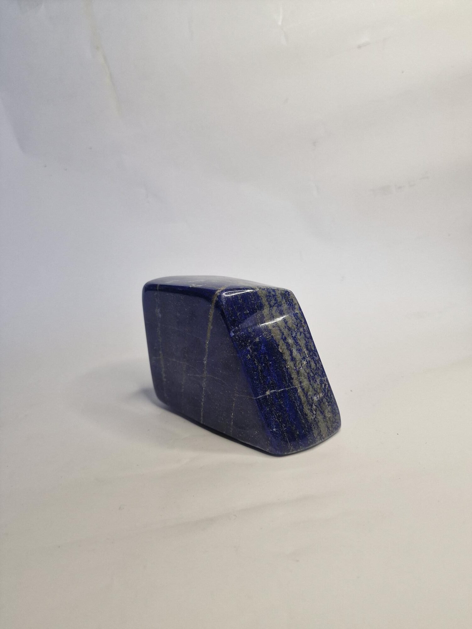 Ce bloc poli de Lapis-Lazuli présente un bleu intense sublimé par de délicates lignes minérales dorées, lui donnant une allure raffinée et naturellement élégante. Sa forme solide et légèrement inclinée apporte une belle présence visuelle, idéale pour un intérieur moderne ou un espace dédié aux pierres.